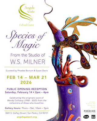 Join us Saturday, February 14th from 2pm – 4pm for the opening of Species of Magic: From the Studio of W.S. Milner, a solo exhibition of works by the late San Pedro artist also known as Wendy Calloway (1948 – 2025).