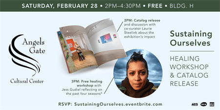 Angels Gate Cultural Center (AGCC) is pleased to present a workshop with artist Jess Gudiel as we honor the past year and celebrate the release of the Sustainers of Life exhibition catalog. Indigenous artist and educator Jess Gudiel will lead a reflection session to release trauma through breathing, writing, dreaming, and setting into place intentions for the next four seasons. The event is free for the community and will take place on Saturday, February 28th from 2pm – 4:30pm in AGCC’s Building H.